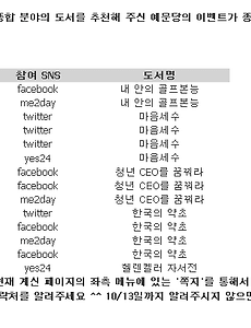이벤트28 [이벤트] YES24+예문당 이벤트 당첨자를 발표합니다~ 지난 10월 4일~6일, 3일동안 YES24와 예문당의 SNS 이벤트가 진행되었습니다. 2011/10/06 - [이벤트 안내] - [이벤트] 내가 읽고 싶은 책도 받고! 기부도 하고! 당첨자를 발표하겠습니다. ^^ 위의 당첨자 명단은 YES24 홍보 블로그[링크]에 소개되었었습니다. 저도 오늘 당첨자 명단을 받기로 되어있어서, 오늘 발송 예정입니다. 혹시, 아직 당첨자 명단을 확인하지 않으셔셔, 당첨 되시고도 모르셨다면, 저희 블로그 하단에 비밀글로 아이디/이름/참여SNS/주소/우편번호/전화번호를 남겨주세요. 기존에 YES24측에 연락처를 남겨주신 분들께서는 다시 남겨주시지 않으셔도 됩니다. 참여해주신 많은 분들께 진심으로 감사드립니다. ^_______^ 2011. 10. 24. [이벤트] 내가 읽고 싶은 책도 받고! 기부도 하고! YES24에서는 24개 출판사와 함께 읽고 싶은 책도 받고 기부도 하는 이벤트를 진행하고 있습니다. 오늘은 예문당 출판사의 책 이벤트 마지막 날입니다. 6권의 책을 좀 더 자세히 소개해드릴께요. '마음세수'는 공학도가 말하는 행복론입니다. 가장 중요한 것이 마음이지요. 내 마음속을 들여다보며 현재의 나를 돌아보며 앞으로 나아갈 희망을 찾아가는 이야기입니다. 책 정보 : 마음세수 - 현재를 바꾸지 않고 행복해지는 삶의 방법 '헬렌켈러 자서전'은 장애인 헬렌켈러의 이야기를 담고 있지요. 역경과 고난을 겪고 이겨낸 이야기입니다. 최근 '도가니'에서 헬렌켈러의 말이 인용되기도 했는데요, 그 영향으로 이 책을 신청하시는 분도 계시네요. 책 정보 : 헬렌켈러 자서전 - 역경과 고난을 이겨낸 이야기 '청년 CEO를 .. 2011. 10. 6. [책나눔] 책장정리 기념으로 10권을 나눠드립니다. 선착순이요. ^^ 책이 너무 쌓여서 어찌할바를 모르다가, 어제 큰맘먹고 책장정리를 했습니다. 그 중 몇권을 필요하신분들께 보내드리려고 합니다. 허브우먼 http://yemundang.tistory.com/112 요리가 좋아지는 부엌살림 엄마를 부탁해 http://yemundang.tistory.com/410 펭귄을 날게 하라 http://yemundang.tistory.com/333 대한민국 20대, 재테크에 미쳐라 똑똑한 여자들은 다 어디로 갔을까? 성공의 씨앗 LOOKS 영어만은 꼭 유산으로 물려주자! 내 아이가 책을 읽는다 총 10권인데요, 7권은 제가 읽은 책이고, 3권은 읽지 않은 책입니다. 읽은 책 중에서는 낙서나 밑줄이 있는 경우도 있고, 후기를 남겨놓은 책은 3권입니다. 독서후기를 쓰기 시작한지 1년 .. 2011. 6. 1. [이벤트] 설 연휴에 읽고 싶은 책은? 3분께 기회를 드립니다. :) 설 연휴가 얼마 남지 않았습니다. 지난 추석처럼 올 설 연휴도 무척 길더군요. 설날이 2월 3일 목요일이니 설날이 지나고도 금토일 무려 3일이나 쉴 수 있습니다. 이런 황금 연휴에, 책 한권 읽으면 좋겠지요? 그래서 준비해봤습니다. 이번 이벤트의 제목은 '설 연휴에 읽고 싶은 책은?'입니다. 지난 이벤트에서 저희 책 2종을 선택해주셔서, 이번에는 아예 저희 책 2권과 읽고 싶으신 책 1권을 넣어서 총 3분께 혜택을 드리기로 하였습니다. 저희 책부터 소개해드릴께요~ 1. 청년 CEO를 꿈꿔라 20·30대 CEO들이 만들어가는 이야기로 2010년 11월 25일에 발행된 예문당 신간입니다. 대학 입학·졸업 선물로도 좋습니다. 꿈과 희망을 드리고 싶어서 만들어진 책입니다. 관심있으신 분들은 신청해주세요. 리뷰.. 2011. 1. 20. [이벤트] 올해가 가기 전에 읽고 싶은 책은? 12월입니다. 이제 2010년도 얼마 남지 않았습니다. 여기저기 올 한해 있었던 일들을 정리한 이야기들이 나오고 있습니다. 저도 괜히 올 한해를 생각해보고, 내년을 맞이하기 위한 새로운 다짐도 하게 됩니다. 한해를 보내는 웬지모를 아쉬움, 내년을 기대하는 설레임이 있지요. 제가 보내드린 책 한권에 좋은 기운을 얻으셨다는 이야기를 듣고, 이번 이벤트 제목은 이렇게 정해보았습니다. '올해가 가기 전에 읽고 싶은 책은?'입니다. 읽고 싶은 책을 소개해주시는 분들 중 1분께 추첨을 통해서 읽고 싶으신 책을 구입하여 보내드리겠습니다. (단, 정가 2만원 이하. 알라딘에서 판매중인 책으로.. ^^) ■ 신청기간 : 2010.12.16.(목) ~ 2010.12.18.(토) ■ 신청방법 : 를 댓글로 남겨주세요. .. 2010. 12. 16. 트위터가 뽑은 좋은 책, Best 10 트위터 하시나요? 트위터 안에는 책에 대한 생각을 나누는 '북트윗'[링크]이 있습니다. 출판사에서 자발적으로 도서를 홍보하고, 독자분들도 자발적으로 책 읽은 내용을 공유하는 공간인데요, 올해 6월에 서비스를 시작하였습니다. 그동안 160권의 도서가 등록되었다고 합니다. 연말을 맞이하여 가장 많은 사랑을 받은 책 10권을 선정했는데, 저희 '그림책 육아'도 선정되었습니다. ^^ 많은 분들의 사랑에 보답하고자, 북트윗과 해당 책을 소개한 출판사에서는 이벤트를 마련하였습니다. 어린이 재단에 2,000원을 기부하고, 당첨되신 분들께는 원하는 책을 선물하는 이벤트인데요, 자세한 사항은 다음과 같습니다. 공정성을 위해서 북트윗으로 송금하지 않고, 어린이재단에 직접 기부하는 방법을 선택했습니다. 당첨자가 선정되면 .. 2010. 12. 8. 이전 1 2 3 4 5 다음